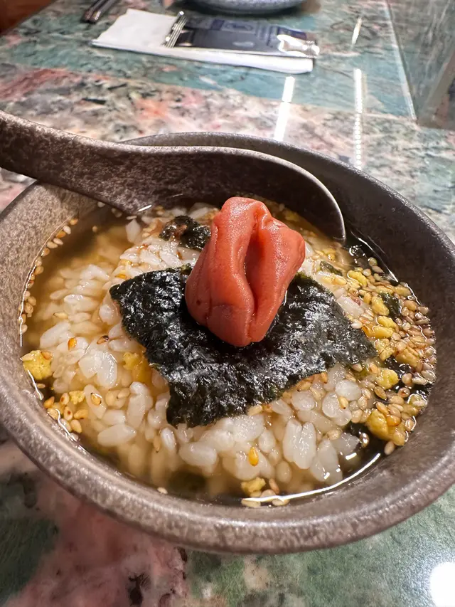 以柔軟米粒吸收湯汁,梅子酸香點亮味蕾,熱辣辣的非常好味!