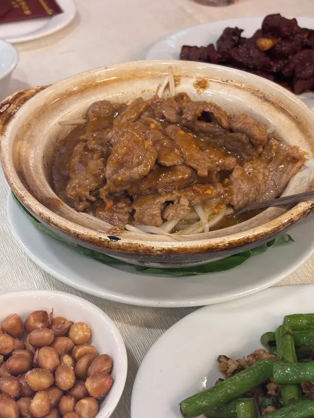 •🥘沙嗲金菇牛肉煲:端上桌还在咕嘟冒泡,秘制沙嗲酱裹着嫩滑的牛肉和吸饱汤汁的金菇,甜香带点南洋香料味,配米饭能炫两碗!