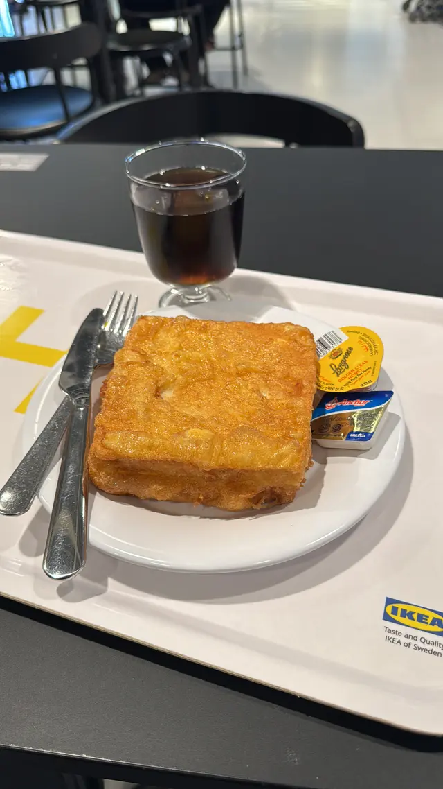 IKEA嘅西多士真是一個平民版嘅幸福!厚切嘅麵包外層煎得金黃香脆,咬落去中間軟綿綿,帶有濃郁嘅蛋香,配上少少糖漿同牛油,甜而不膩,簡單卻好滿足。雖然唔係高級餐廳嘅出品,但勝在味道正宗,份量夠,$23嘅價錢真係抵到笑。食落去有種港式茶餐廳嘅懷舊Feel,令人回味小時候嘅下午茶時光。