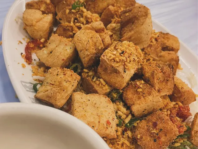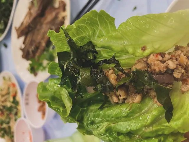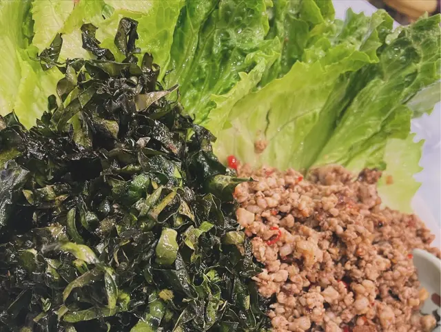 辣肉碎+炸左嘅介蘭葉同生菜包住一齊食,真係好好味!