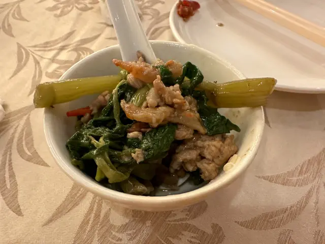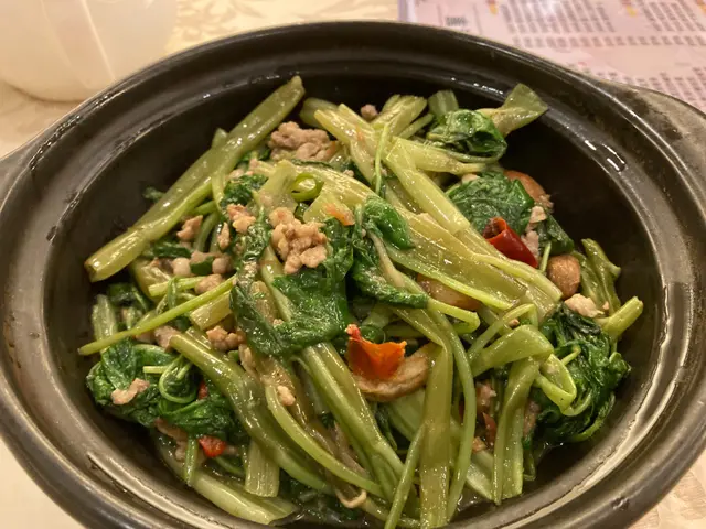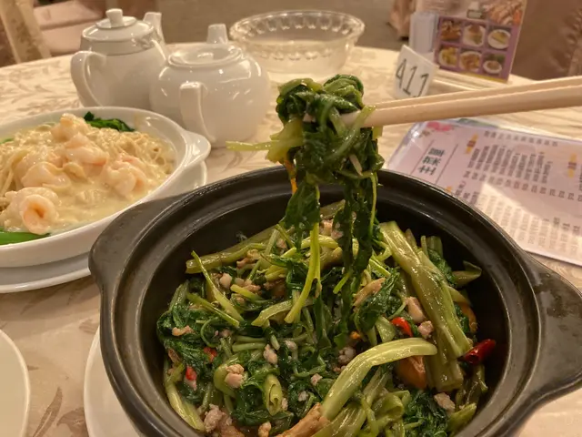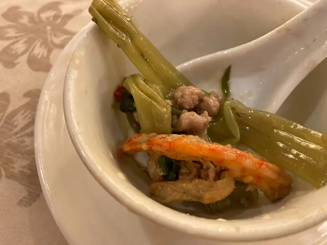啫啫蝦乾蝦醬通菜成碟通菜非常之大兜,同時上菜嗰陣時熱辣辣,聞到好大浸蝦醬味,風味十足,令人食指大動。味道方面,除咗有大量通菜同埋蝦乾之外,仲有好多蝦醬同埋肉碎,呢啲肉碎同埋通菜都充滿着蝦醬咸香嘅味道,十分有風味。通菜食落亦都新鮮幼嫩,唔會煮得好老,咬落爽脆。