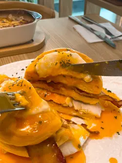 半鹹半甜嘅梳乎厘ɢᴇᴛ🤣 呢到嘅日式梳乎厘係超鬆軟😍 而最上層係一切就流心嘅蛋蛋🥹 加埋中間夾住鹹香嘅煙肉🥓 口感層次豐富~ 估唔到意外地ᴍᴀᴛᴄʜ✨