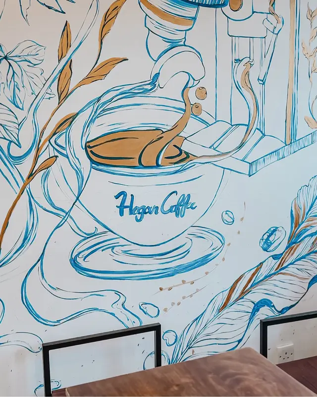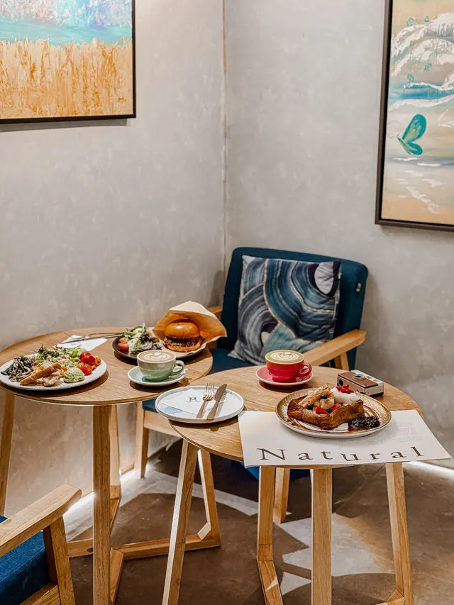 小房間各種藍色佈置跟畫作與外面光亮用餐區