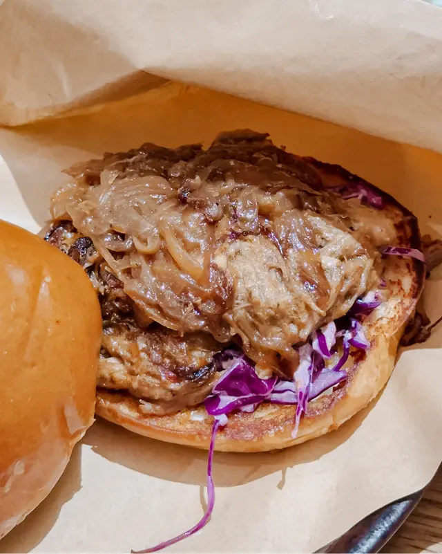 鹹香豬肉絲跟炒得焦香的洋蔥夾在漢堡裡面