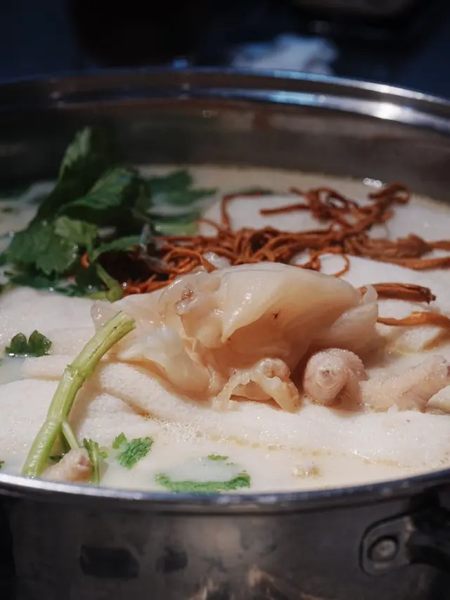 用左成隻新鮮雞/野生竹笙/花膠去煲嘅濃湯, 打邊爐前一人都飲左幾碗, 超級濃雞味, 帶點膠質嘅口感, 雞嫩滑鮮味, 入面嘅竹笙超長, 吸收哂湯嘅精華又爽脆, 超好食!