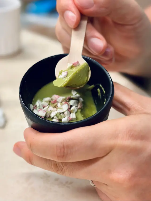 香滑奶凍帶有抹茶香味,上面加了點無花果凍乾,非常清甜