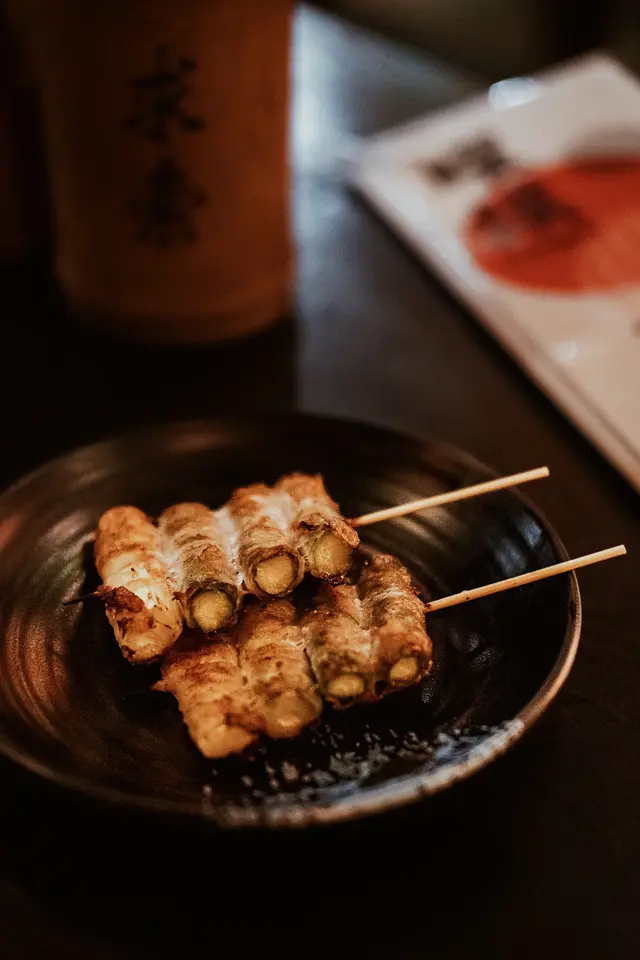 ◍「雞翼串、豚肉蘆筍卷、豬肉棒、香蔥牛、蛋白豬肉卷」🍢