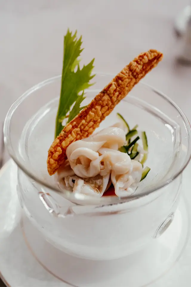 將象拔蚌切絲,配上用泰國青檸、洋蔥、指天椒、魚露製作嘅酸辣汁。