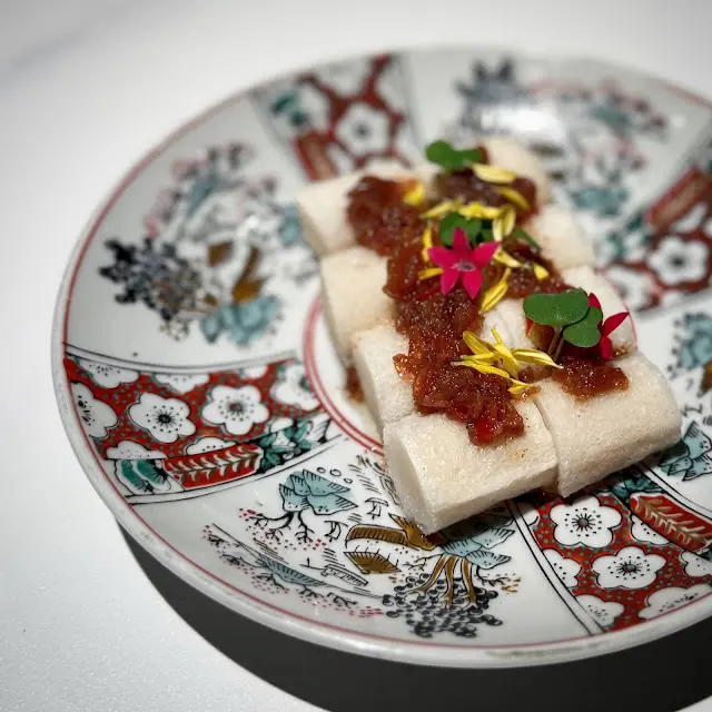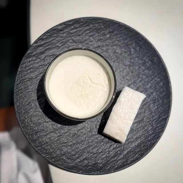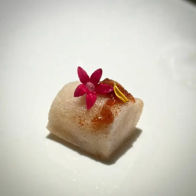 第一道來到我們面前的菜式是竹笙釀日本帶子慕絲配秘製XO醬,驟眼看有點像淮山般的模樣,不過要細意品嚐才感受到這菜式箇中精彩的細節。