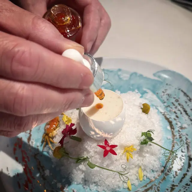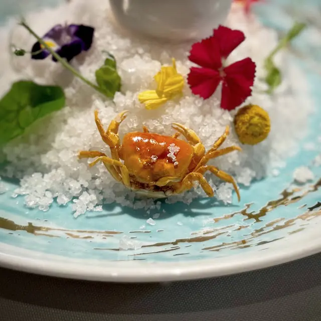 品嚐前由服務員在雪白的花雕蟹蒸蛋白上畫龍點睛!將自家煉製的蟹油滴於蛋殼之上,此舉將成個畫面變得更加豐富。