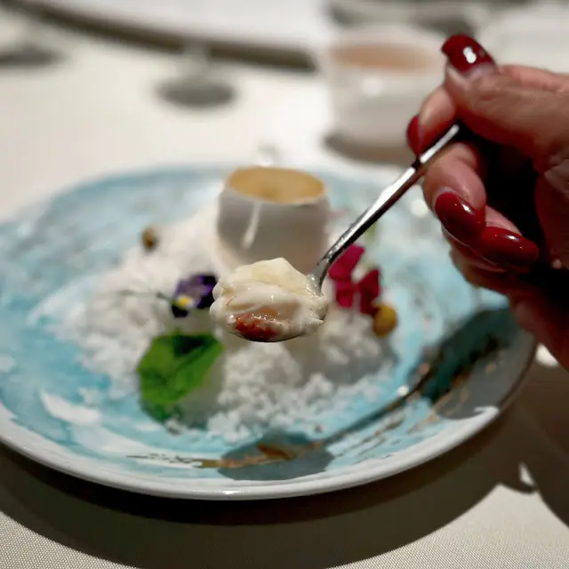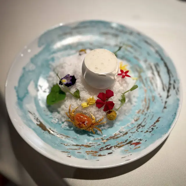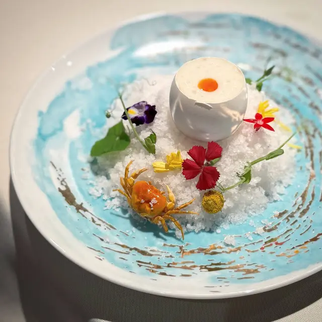 緊接著這道美絕的花雕蟹蒸蛋白配百合泡賣相非常吸睛!擺盤感覺如在陽光海灘中很有渡假的感覺。