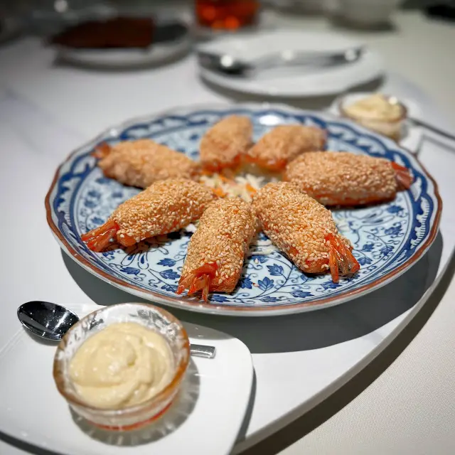 然後我們可以品嚐到非常香口的蝦多士!即叫即炸的蝦多士賣相金黃耀眼而且非常飽滿,絕對是客看見便令人食慾大發的菜式,佈滿香濃芝麻的蝦多士口感非常香脆,最重要的是絕對沒有油膩的感覺,滿滿有質感的新鮮蝦肉和蝦膠吃下非常有彈性,沾上點點蛋黃醬來品嚐味道更加吸引。
