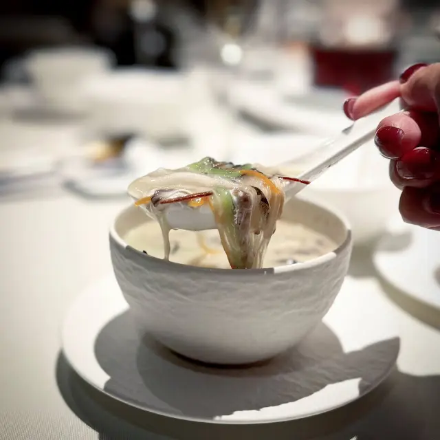 順德魚雲羹絕對是順德手工菜的佼佼者!這碗濃郁的手拆魚羹由魚湯、魚雲以至配料也是廚師團隊一絲不苟的心血,大家真的要細意慢慢好好欣賞。