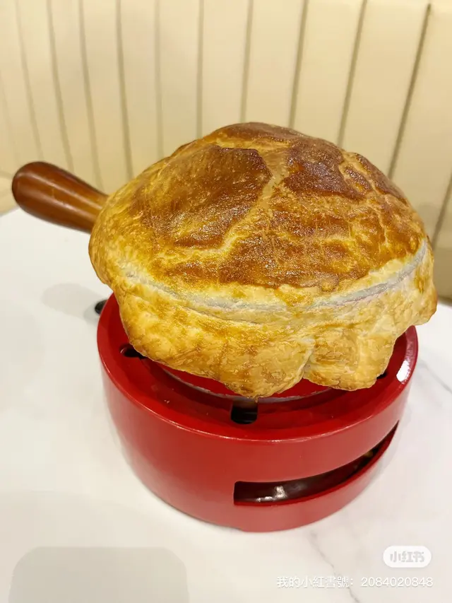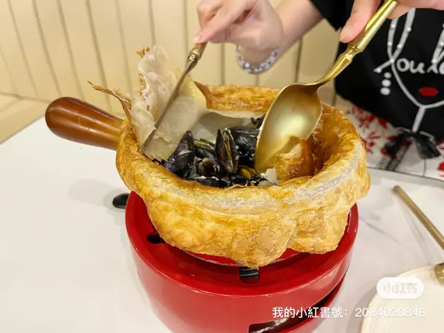 一上菜,係用個爐上菜,一滾時個煲從酥皮中出晒煙,果然係火山。依個時間要好有儀式感地用鎚仔卜爆佢,很好玩。藍青口比平時食開既更細隻同更有海水味,配上忌廉汁好味。最後用汁點返酥皮,正。