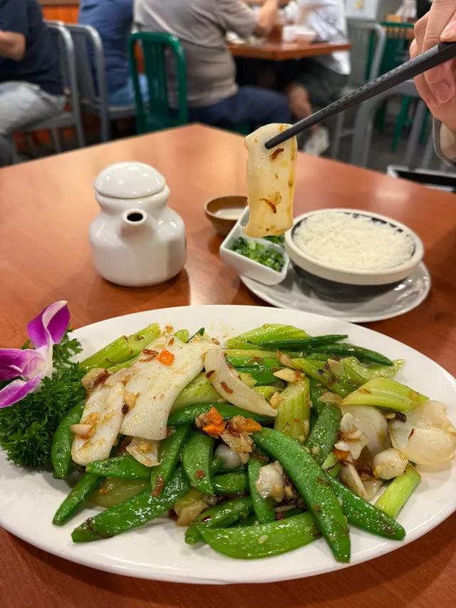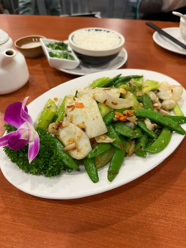 見到牆上面有海報,是新菜式,花枝片切得厚薄適中,炒至剛熟,保持爽滑彈牙。XO醬香辣適中,帶有干貝與蝦米的鮮香,炒得火喉十足,西芹和荷蘭豆都好爽口清甜!