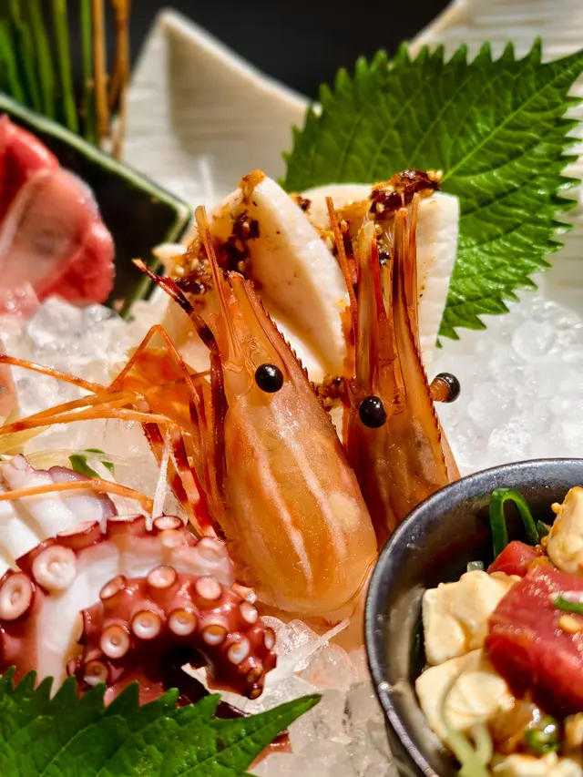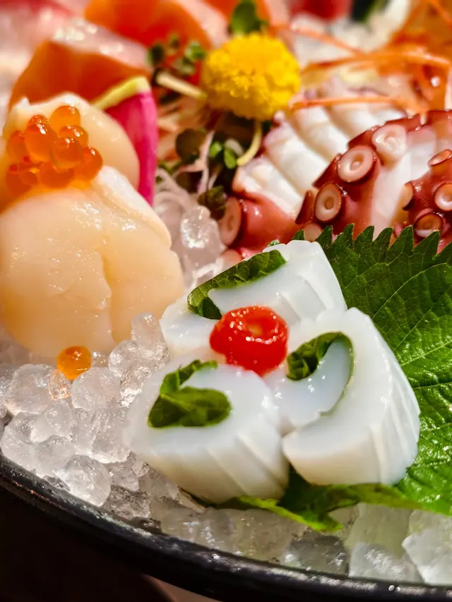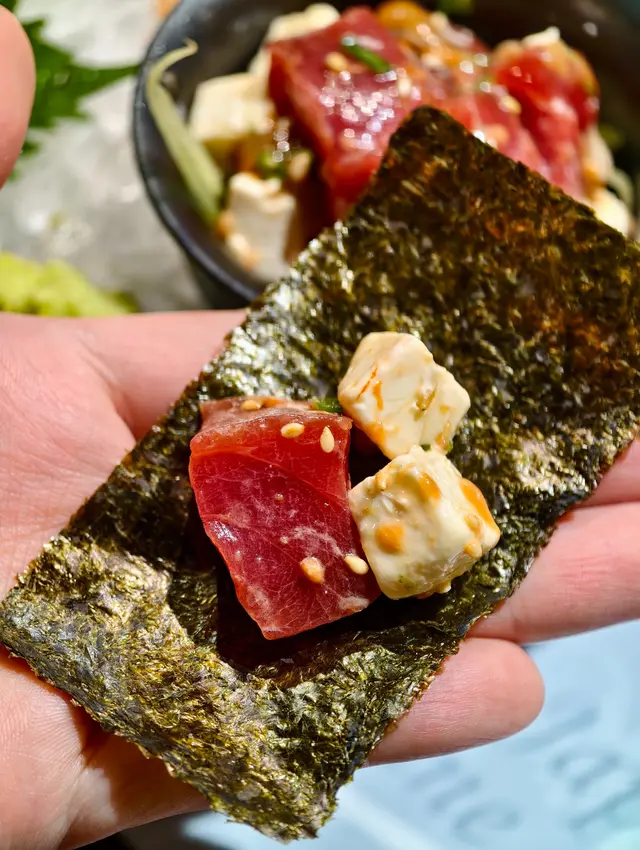 刺身都非常新鮮,而且很有驚喜的,特別是八爪魚,跟普通的天差地別,口感特別脆嫩。油甘魚腩鮮甜嫩滑又有油香。劍魚腩口感帶點脆,但油脂挺足的。牡丹蝦特別香甜,口感軟糯。更有特別搭配酒盜芝士配吞拿魚赤身,味道濃厚鹹香,芝士香滑,赤身魚味突出,吃的時候用紫菜包著來吃,味道更香。