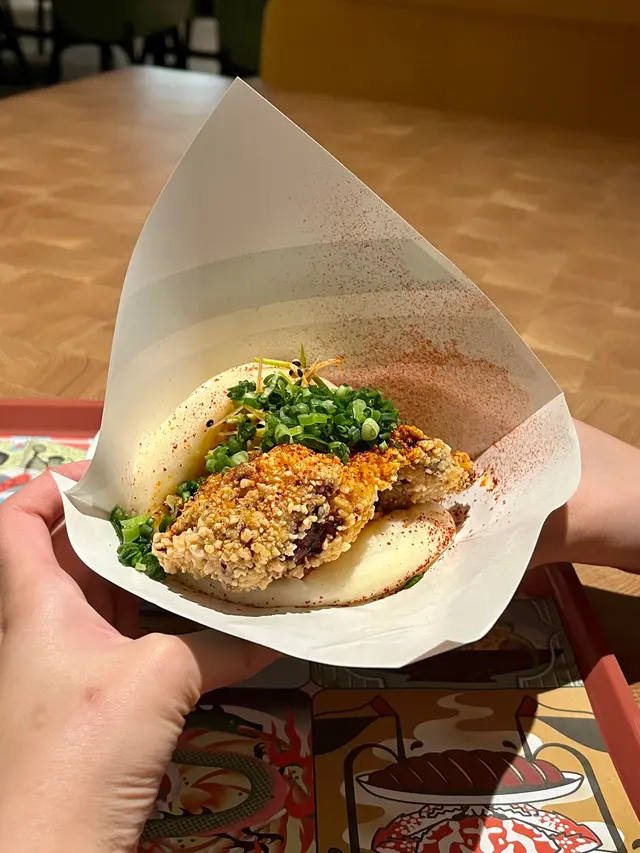 刈包白雪雪質感好軟熟 夾住大塊熱辣辣嘅脆皮雞扒 滿滿肉汁醃得惹味😽最特别就係自家制泡菜奶油芝士汁以及葱花 翠玉瓜絲等配料 鹹辣味道互補 額外多咗層爽脆口感😏