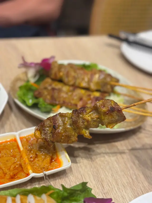 泰式串燒(牛):燒的時間剛好,豬同牛都肉質嫩滑有肉汁,泰烤豬肉串口感耐嚼,有越嚼越香的感覺,充滿微酸辣的泰式風味!! 那種微酸香的風味可以在佐上一點沙嗲醬,沙嗲醬充滿花生醬香,仲有花生顆粒,帶有焦感,香脆可口,好味。