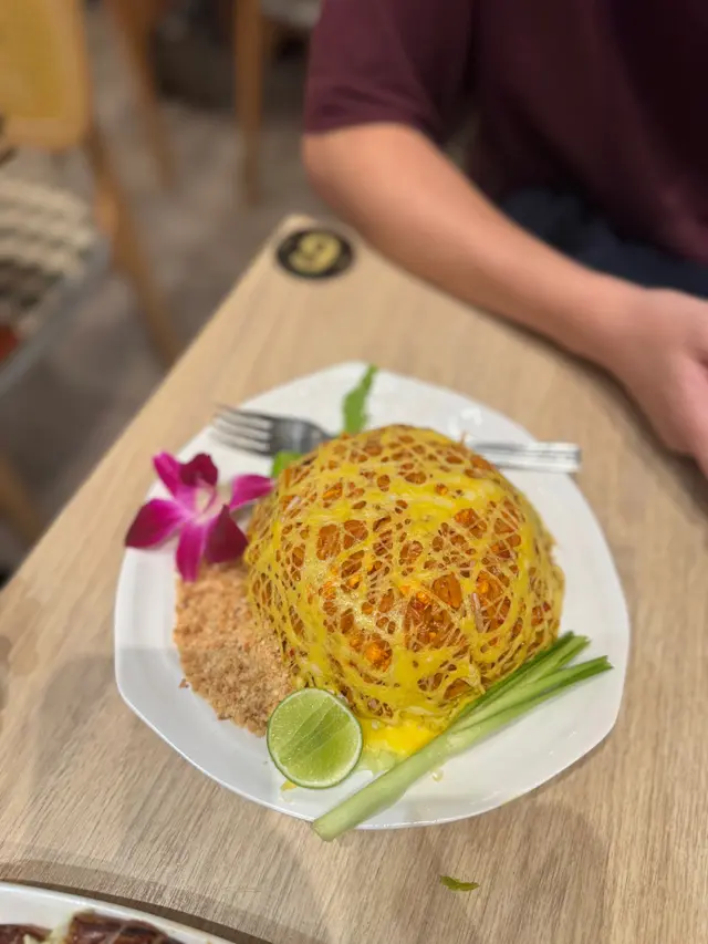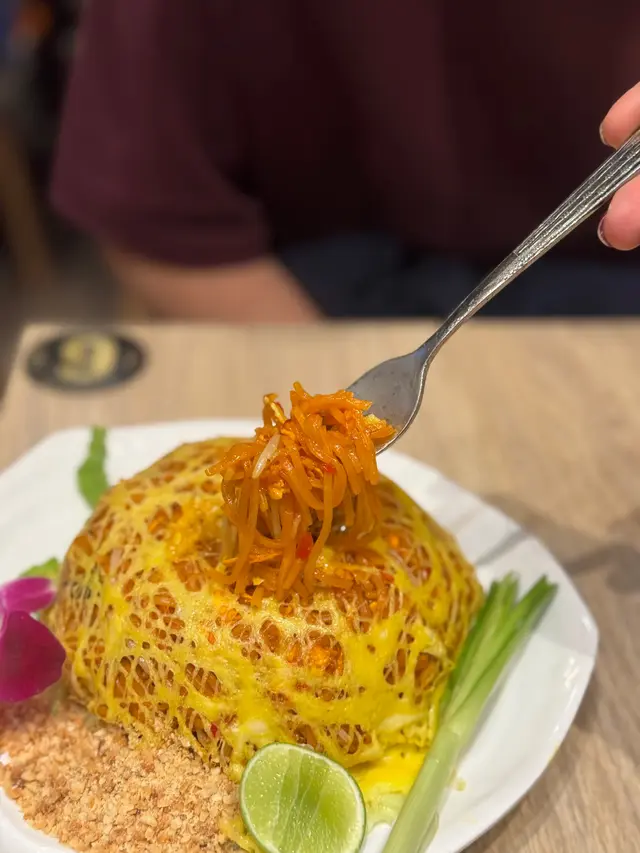 泰式蛋包金邊粉:金邊粉好夠鑊氣,而且炒得好香,配上脆口花生碎同辣椒粉,非常惹味👍仲有大量豆腐干,芽菜,爽彈大蝦。調味方面,主要用了羅望子醬、茄汁、椰糖及魚露,形成酸辣咸甜於一身,讓人垂涏欲滴,味道帶甜,金邊粉夠曬干爽不會一餅餅,富彈性咬口,不錯。