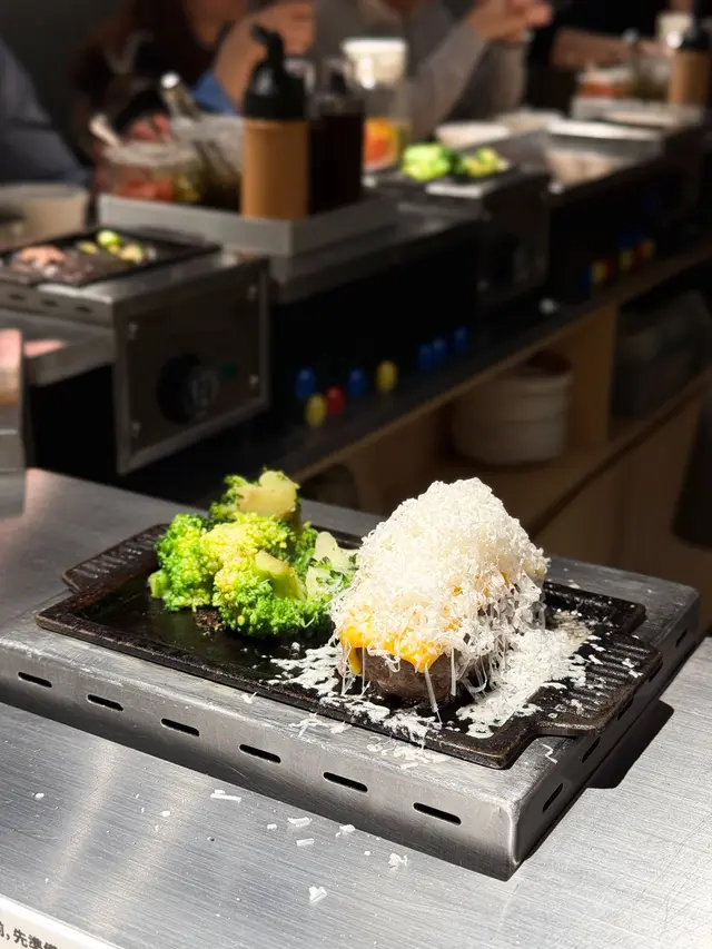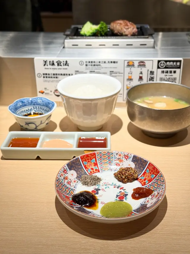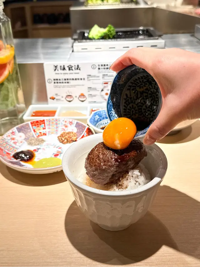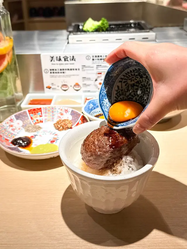 漢堡排使用由九州黑毛和牛同美國牛肉混合製成🥩, 漢堡排係逐件上, 會預先煎至五分熟, 然後放喺你面前嘅鐵板上🔥, 慢慢加熱至自己喜愛嘅熟度