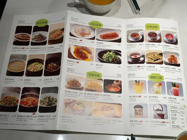 餐廳以園林風為主題,讓人彷彿置身於古代的大自然中。餐廳的設計有好多綠意盎然的植物、清新的竹葉和精緻的裝飾元素,環境優美舒服,都有種恬靜的氛圍。