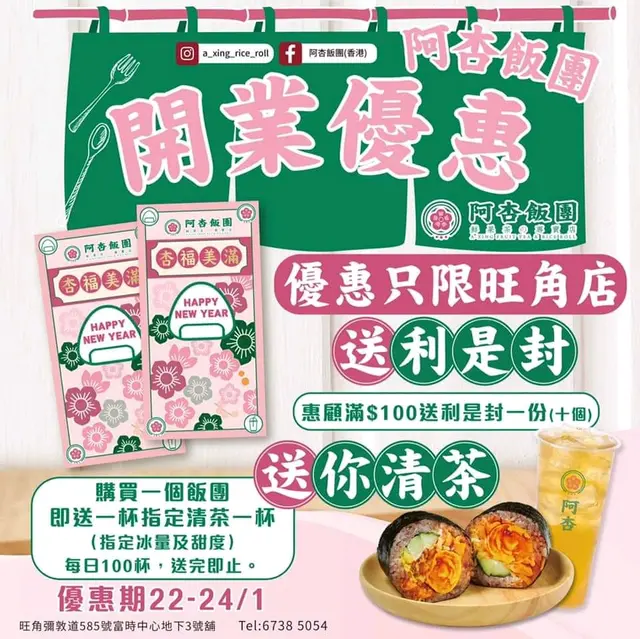 呢間剛開,現試業中,見有開業優惠, 消費滿100蚊送粉紅靚靚阿杏利是封,購買一個飯團送指定清茶,優惠期只限1月22至24號!要再來🥰🤭