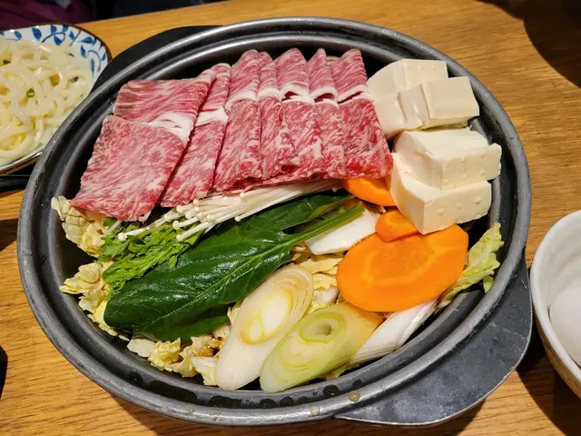 大和牛壽喜燒加烏冬,大量蔬菜配豆腐和牛肉,湯頭比較甜膩。