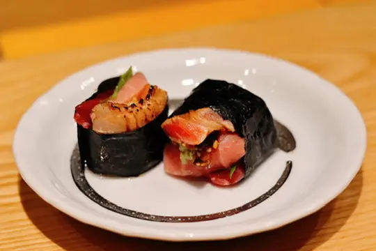 首先係富士山白三文魚,鋪咗三色芝麻同竹炭,口感軟嫩仲有芝麻香,層次好豐富