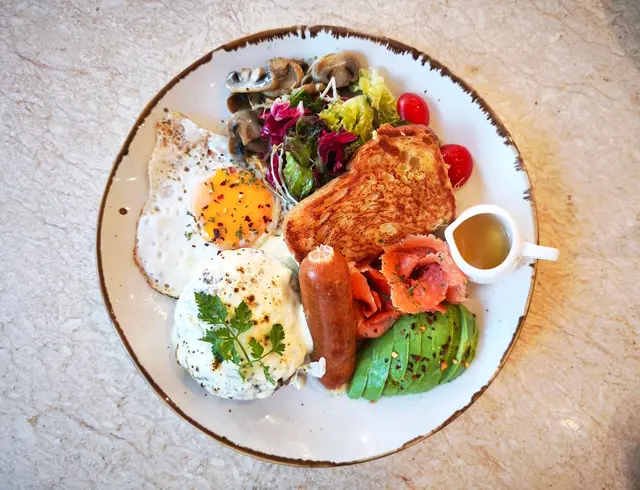配埋煙三文魚、煎蛋、香腸、炒野菌、番茄仔, 牛油果, 沙律菜 & 多士, 份量十足, 好豐富丫!!!