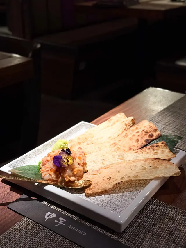 擺盤精緻, 將牡丹蝦魚生切成細碎並調味, 再混入松子仁、米通、三文魚籽, 再以魚子醬做點綴~ 放上烤鱈魚片一齊食, 充滿鮮味, 味道層次豐富, 成個組合好夾!