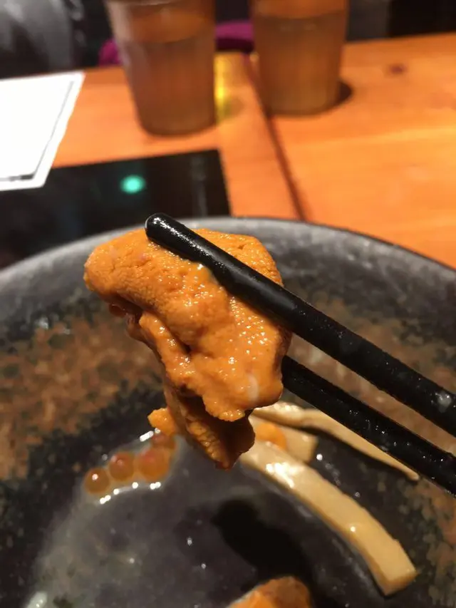 海膽沾麵($188)的賣相讓人口水直流:三大片鮮橙黃色的海膽,圓圓飽滿的三文魚子。海膽新鮮甜美,個人建議單吃,不須配紫菜,以免掩蓋了海膽的甜味。比海膽更好吃的,是用龍蝦及海膽熬製的沾麵湯底,好濃郁,跟平常的湯底不同之處是,鹹鹹的湯底中帶著海鮮的鮮甜,麵條掛上湯汁非常美味,讓人一口接一口吃過不停。由於湯底上桌時不算熱,建議用桌上的電池爐加熱後再沾麵會更好吃,冬天就是要吃熱呼呼的東西才舒服。