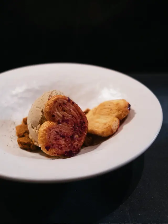 玫瑰蝴蝶酥正正常常;雪糕有焙茶香,唔算奶味好重,口感偏向似雪芭;底底墊了曲奇餅碎,整體可以啦👌🏻