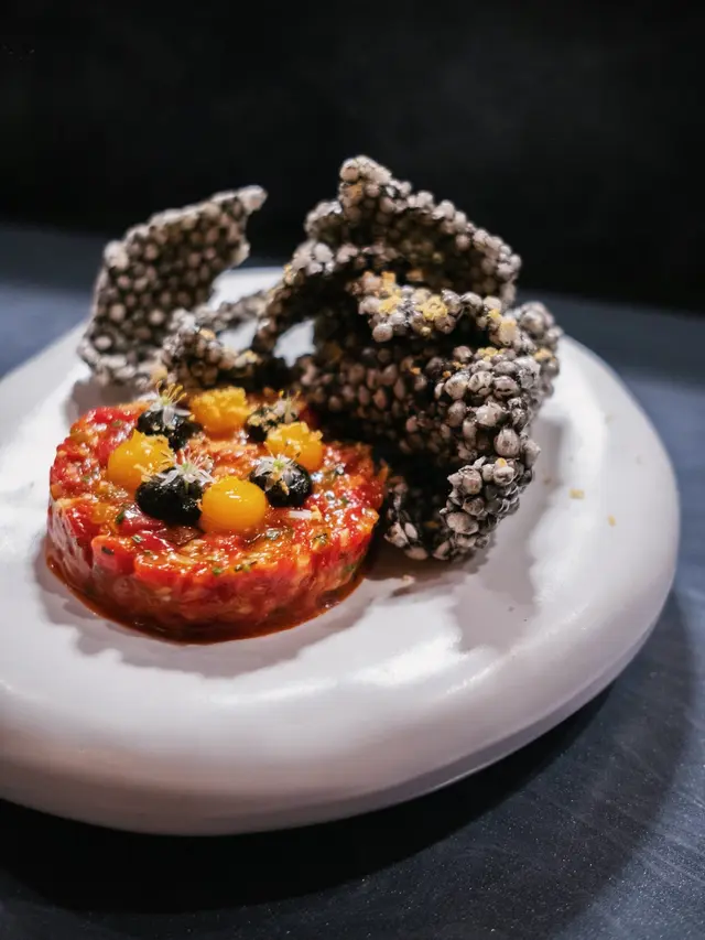 店員有介紹過這是屬於較重口味的前菜,果然!生牛肉混和了鵪鶉蛋液份外滑溜,吃到韓式辣醬的辣、蘋果和風汁的甜,甜甜辣辣的味道十分濃郁,什至乎稍為蓋過了牛肉的鮮味,有感可惜😢獨特的西米脆餅口感清脆,帶墨魚汁的香氣,記得要趁熱食!