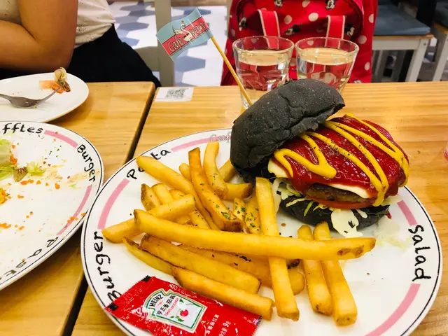 睇完餐牌後,我地就點咗一個蝦胡麻沙律、烏卒卒澳洲和牛漢堡、雞粒;另外點咗一杯生薑伯爵茶、紫薯紅豆牛奶同埋洛神玫瑰花水果茶。