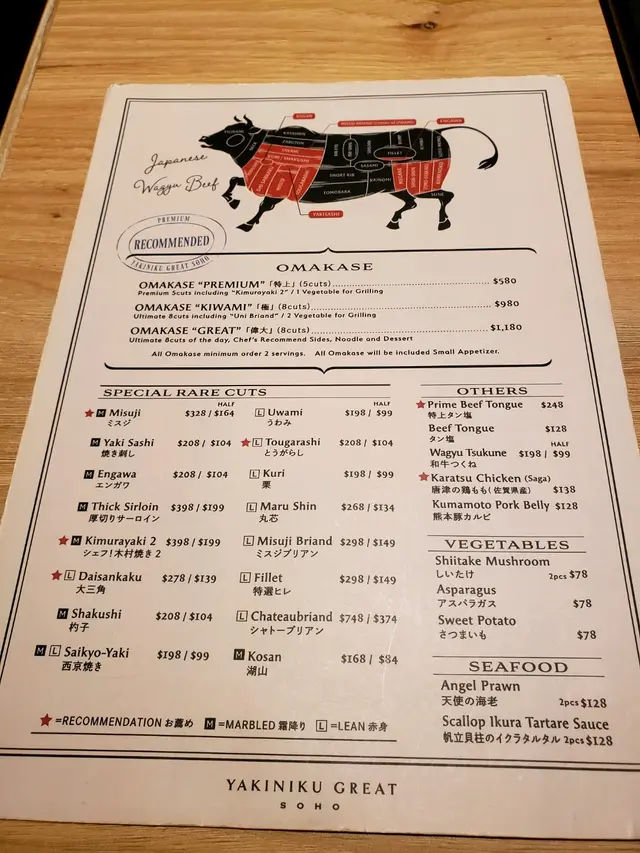 餐廳分別有三款唔同嘅套餐,我哋就order咗一個中間價位$980位嘅套餐。呢個中間價位嘅套餐會畀最貴嗰個套餐少咗五個前菜小食,但係都唔緊要,因為呢個套餐入面已經包含咗和牛裏面最靚嘅肉。