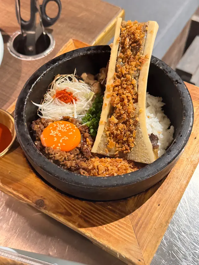 最後嘅牛骨髓石頭鍋飯簡直係靈魂!熱辣辣嘅石鍋將飯粒逼到粒粒分明,底層仲有金黃脆卜卜嘅鍋巴,挖一勺融化嘅牛骨髓拌飯,綿密得似奶油,連埋脆鍋巴一齊食,口感層次超豐富!