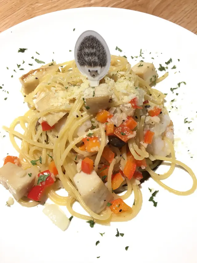 妹妹前幾天已在這餐廳用過膳,她說意粉很好吃,咖啡做得很出色,今天下午她和我們一起再去光顧,分別點了大蝦意粉,焗肉醬意粉,香草意粉等...咖啡和飲品半價,由於我不喝咖啡,所以點了熱朱古力,二妹點了栗子咖啡,她說那隻刺蝟公仔喝到底都沒變形,很好喝,而我的熱朱古力上面刺蝟公仔都很可愛。食物方面,焗肉醬意粉的醬汁比例剛好,不太多也不太少,味道溫和,意粉比較幼身和硬,是我喜歡的軟硬度,而香草意粉有淡淡香草味,整體價錢也合理,雖然前面有一個大型室內的小朋友playground,但環境尚算寧靜,是三五知己聊天的好地方。
