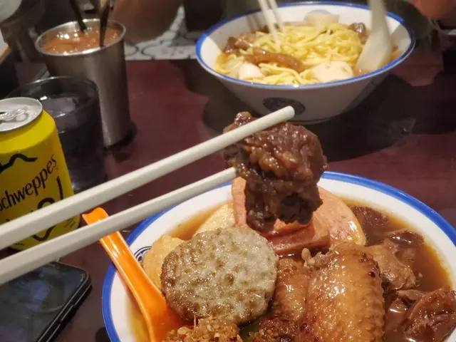 我的車仔麵內有油麵、瑞士雞翼、漢堡扒、午餐肉、牛筋腩,魚片頭再加埋招牌辣汁、腩汁及辣菜甫。