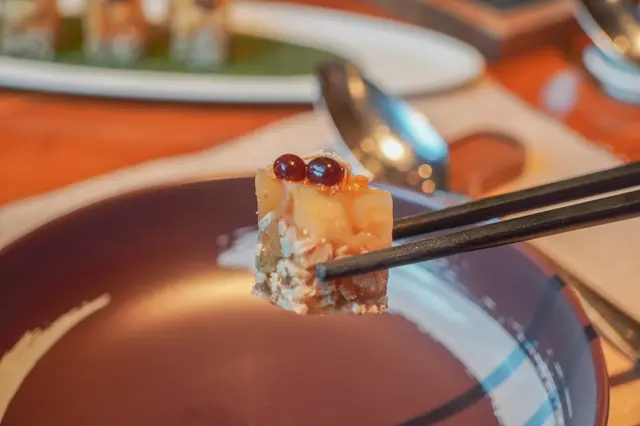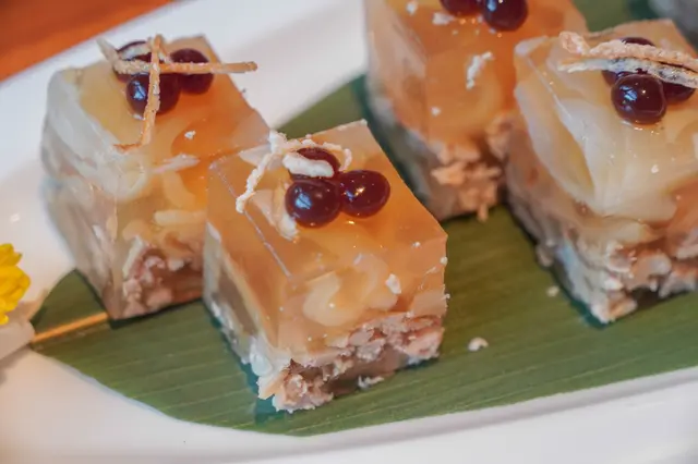 在鴨肉凍上的是醬油啫喱,吃落口感豐富和清爽的一道菜。
