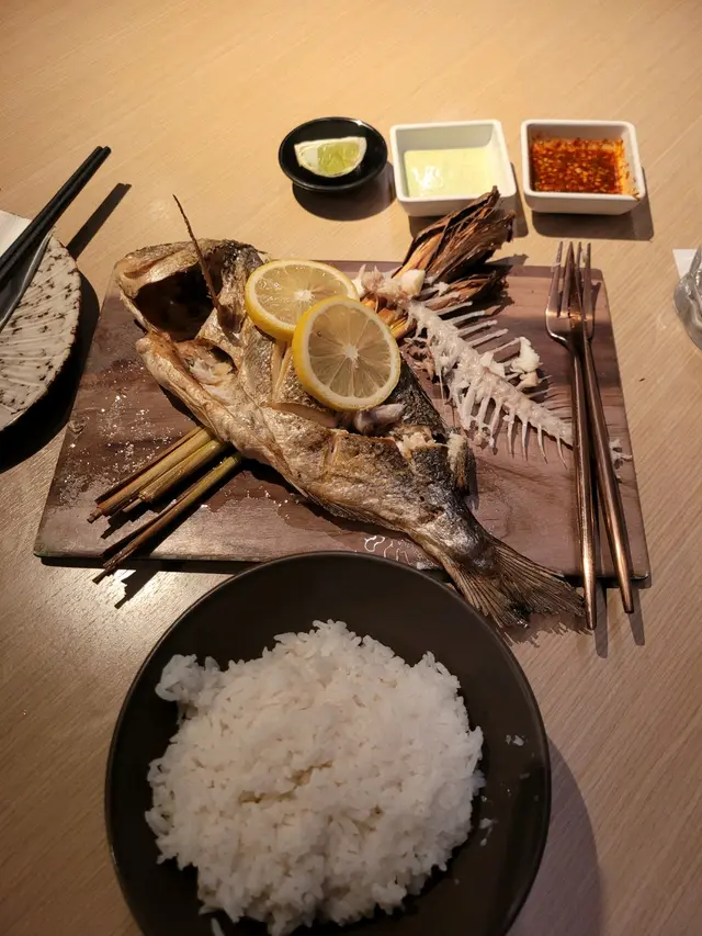 見生日入海洋公園玩有張八折卷,所以食埋個晚餐先走。一個人叫左條炭燒鲷魚加飯,埋單都係約260hkd.味道不差,點埋個綠色醬 同泰式辣醬好好食,又食得飽人。服務員很好,問佢菜色係點會解釋俾我聽,條魚幫我起埋骨。