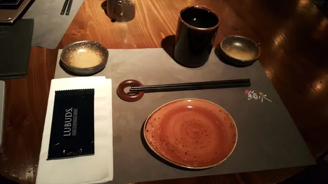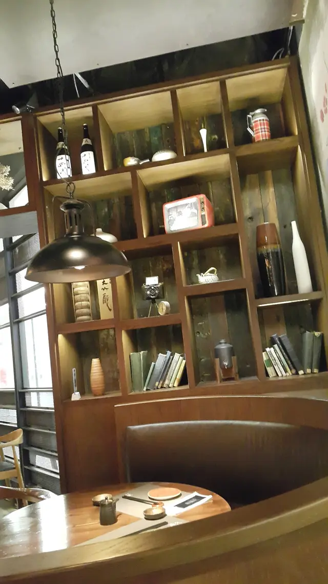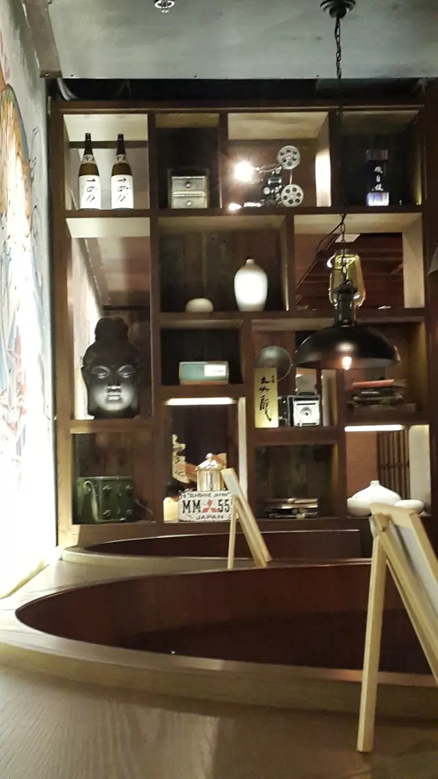 壽司。牆身有木櫃放置了大堆的日式懷舊的物件,例如有舊式收音機、暖水壺、花瓶、相機、清酒樽等.....傳統中可見非常有心思。天花以吊落不少電燈泡,而環境微微昏暗,帶點一些情調,我們被安排坐在餐廳旁的圓形卡位,可以自成一角寧靜的環境下可以與友人傾下計。