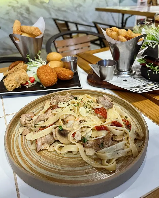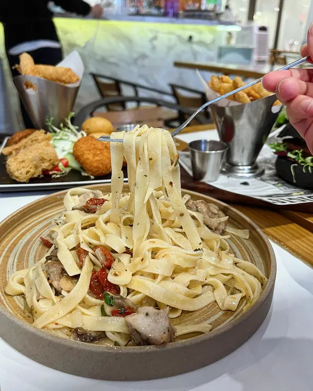 ❥$𝟳𝟬 新鮮白菌、雞肉、蕃茄乾配蒜香辣味橄欖油闊條麵🍝