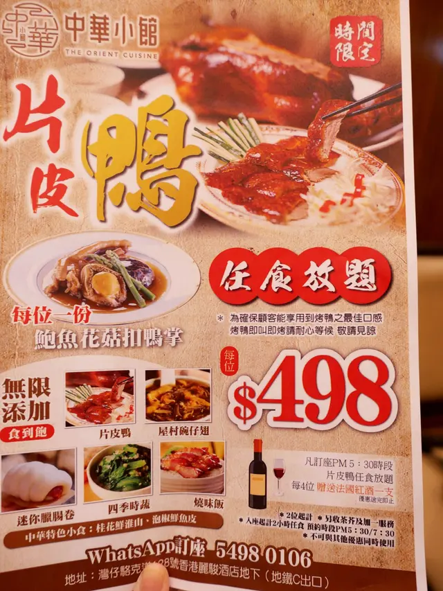 片皮鴨任食放題價錢為 $498一位 (2位起計),預約入座時間為5:30pm 或7:30pm,預約5:30pm時段,每4位贈送法國紅酒一支。