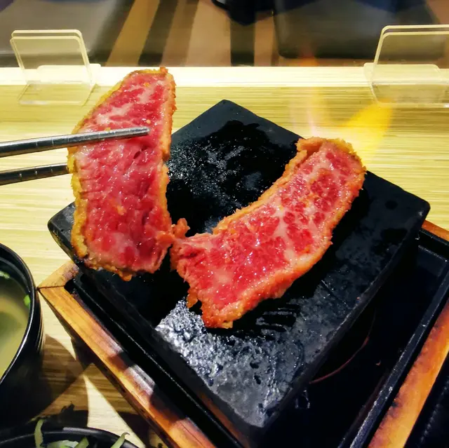 點了"石燒吉列霜降牛小排",餐廳選用美國頂級的Prime牛小排,油花均勻。點餐後送上迷你石燒爐,吃時將牛脂肪均勻地塗在石板上,再將切片吉列牛每邊輕烤10數秒, 可按自己喜好控制生熟程度。