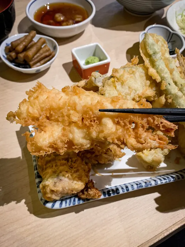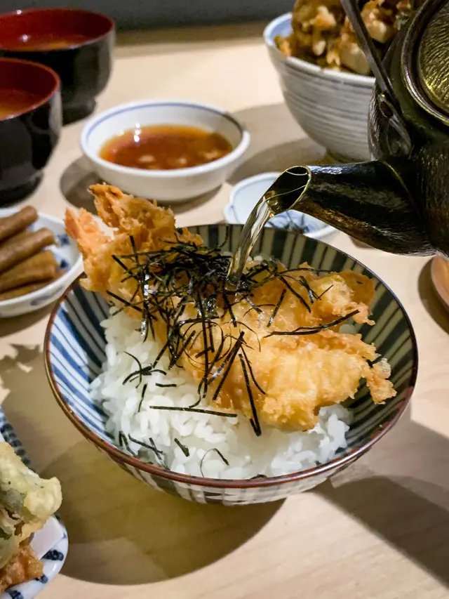 「天丼」係天婦羅丼嘅簡稱,聽落幾咁霸氣,不過我覺得都唔夠眼見咁震撼!店員喺上菜unload個 #軟殼蟹丼 時 感覺連拎上手都有啲困難,我自己再試一次又真係好聚手。呢款係香港限定,除咗軟殼蟹外仲包括皇帝菜櫻花蝦、茄子、南瓜同個溫泉蛋。值得讚嘅係個軟殼蟹都幾厚肉,沾醬油帶返出個鮮香,薄薄一層炸粉令口感昇華,本身唔太好軟殼蟹嘅我都清得晒!至於 #天幕御膳 就因為有三種食法包括 #茶漬飯,所以飯同天婦羅分開上。雖然冇前者咁 IGtable,不過份量都一樣十足十 —— 黑虎蝦、石斑魚配紫蘇葉、軟殼蟹、魷魚、什錦炸物、雞肉、茄子、南瓜同四季豆等,以配料計仲多過軟殼蟹丼,適合咩都想要嘅貪心的小狗。