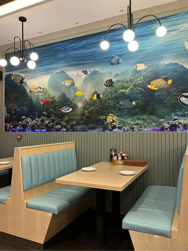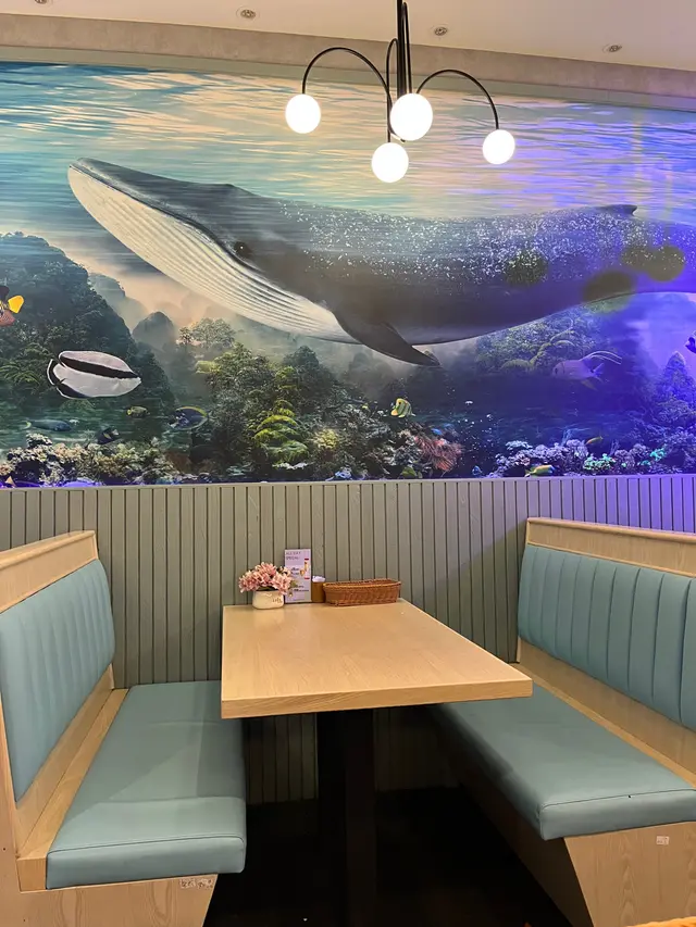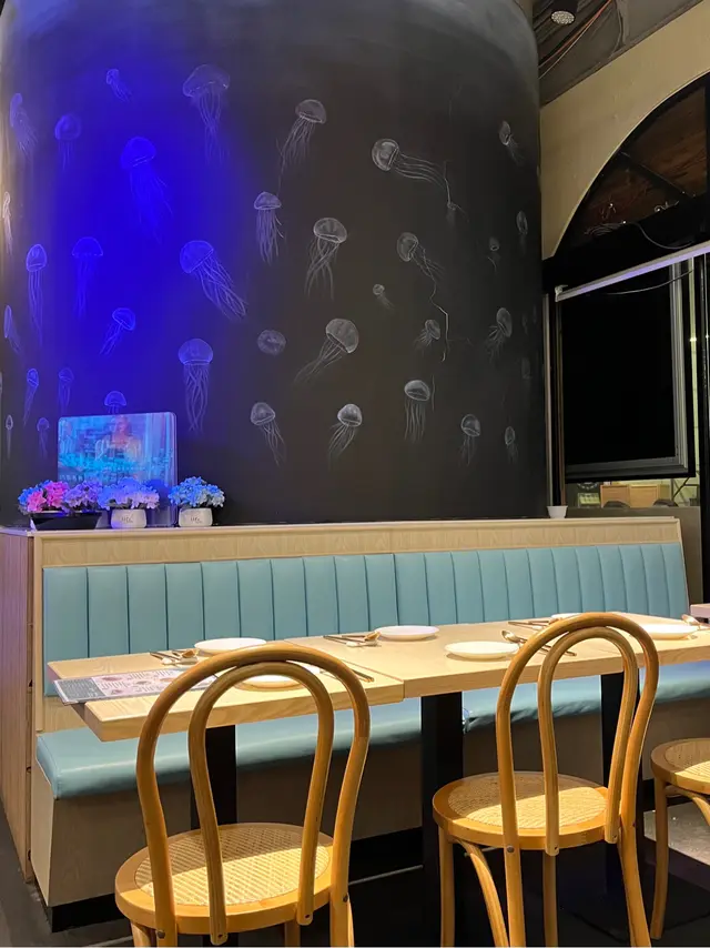 餐廳設計創新的概念,牆身大幅鯨魚及水母牆畫作裝飾,仿如置身水族館。