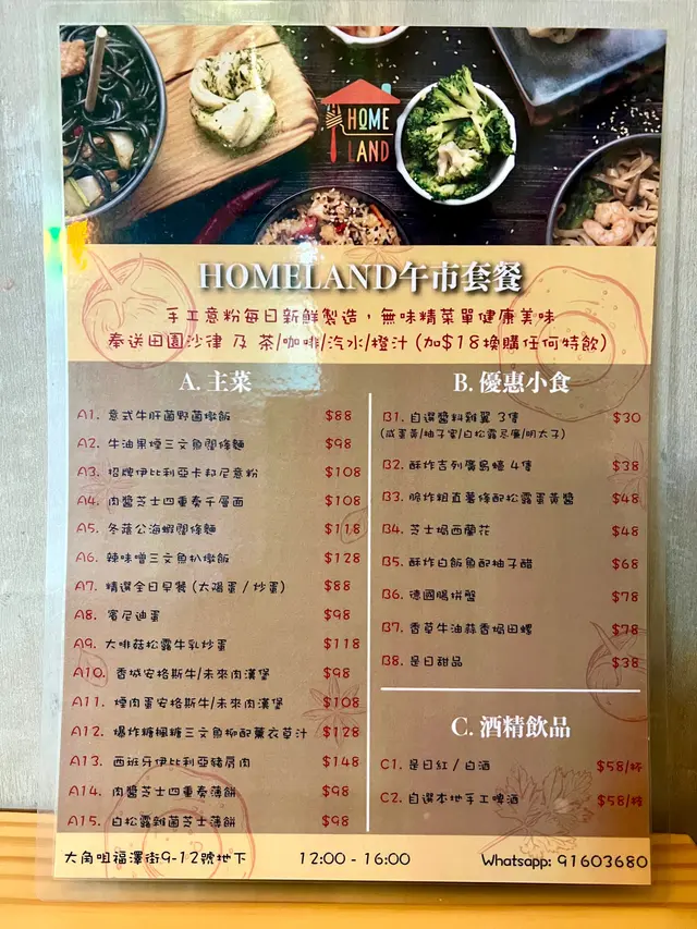 有十多款HOMELAND 午市套餐可以選擇,我哋要咗 $118嘅「冬蔭公海蝦🦐闊條麵 」同埋 $128嘅「辣味噌三文魚🐟扒燉飯」,諗住 share 嚟食😋,午餐包「田園沙律」同「茶/咖啡/汽水/橙汁」😆