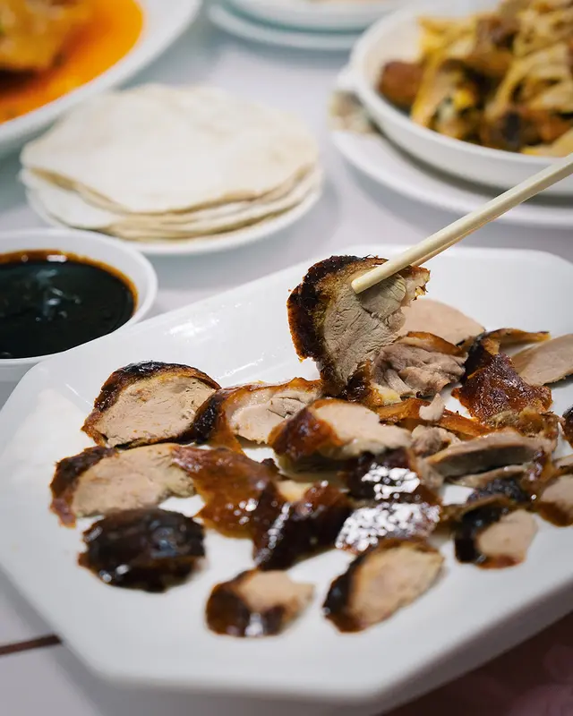鴨皮充滿油脂香氣同焦糖甜香,鴨肉本身味道較為清淡,主要是品嚐鴨油嘅豐腴。搭配甜麵醬、青瓜和蔥絲,味道層次極為豐富🥰