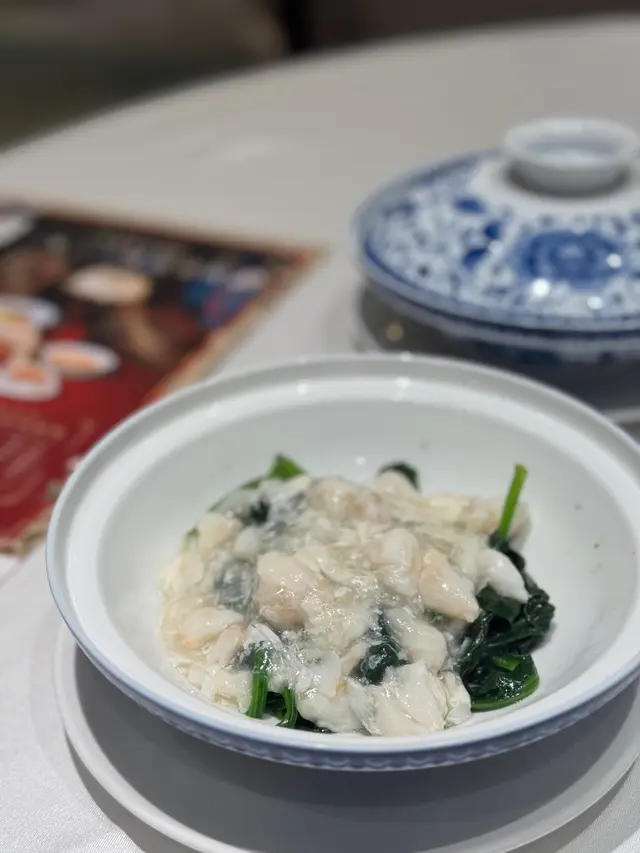 滿滿的蟹肉雪白肉嫩,混合蛋白煮成,菠菜苗鮮嫩香甜