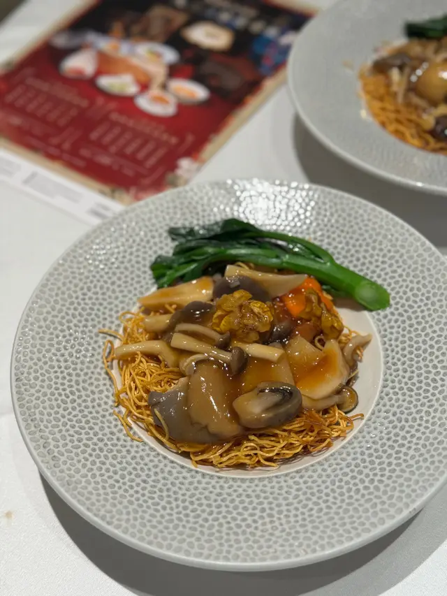 多款菇類爽滑,配搭竹笙、胡蘿蔔及炸至香脆的麵餅,豐富飽足